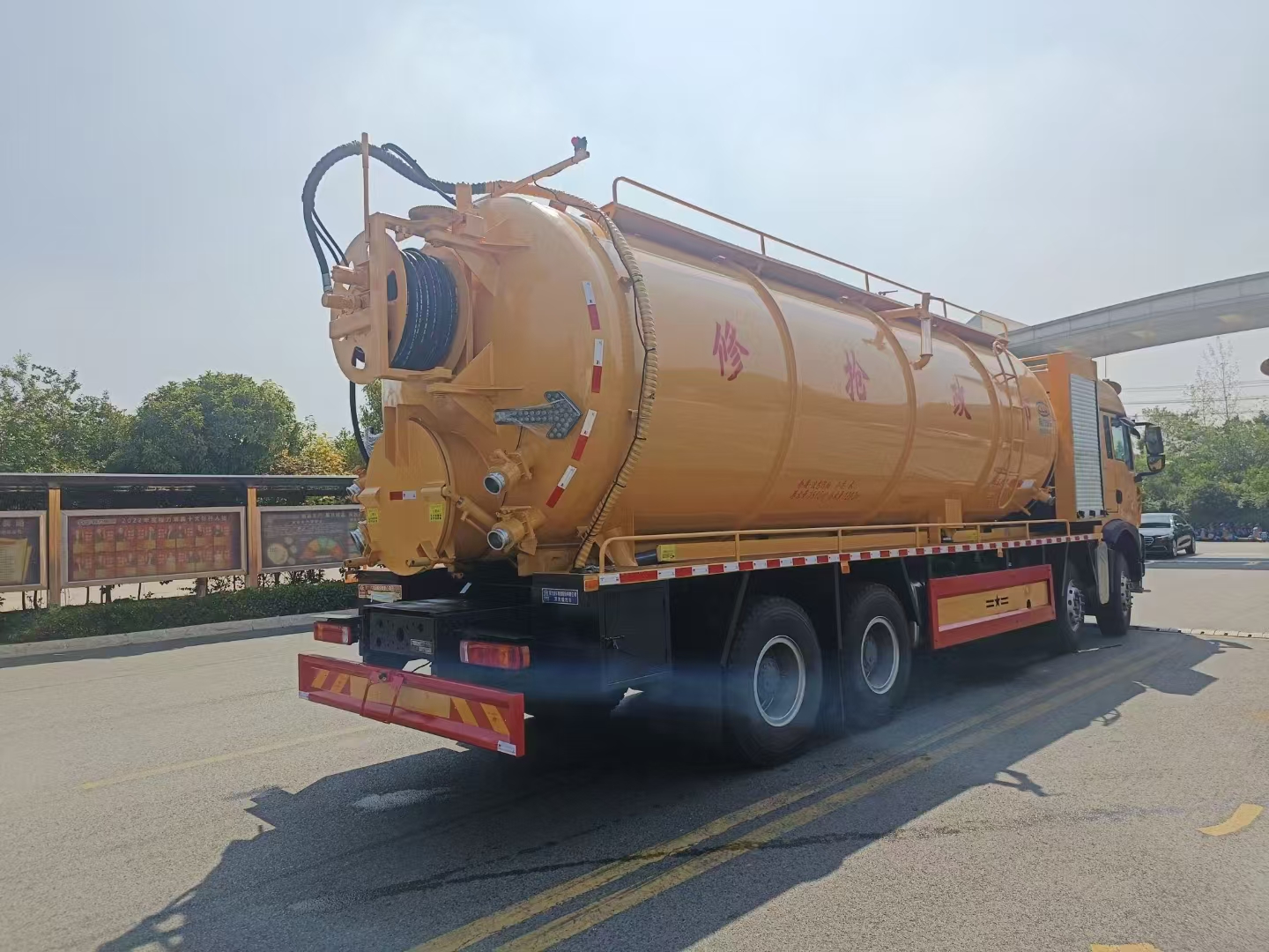 | 上裝配置 | 罐體總?cè)莘e約33立方,清水箱約10立方,其余為污水罐,加強(qiáng)大架,兩倉互通,采用8mm碳鋼制作,吸污部分,副發(fā)采用420馬力配258水循環(huán)泵,8米吸污管,罐體兩側(cè)加寬平臺(tái)加護(hù)欄,后部開一個(gè)600mm液壓開啟排污口,一個(gè)150排污球閥,和一個(gè)100的排污球閥,100內(nèi)抽球閥,后部左右各一個(gè)箭頭燈,配品浮350流量,配100米內(nèi)徑25定制耐磨高壓管,帶卷盤,卷盤液壓左右旋轉(zhuǎn)。 | ||
